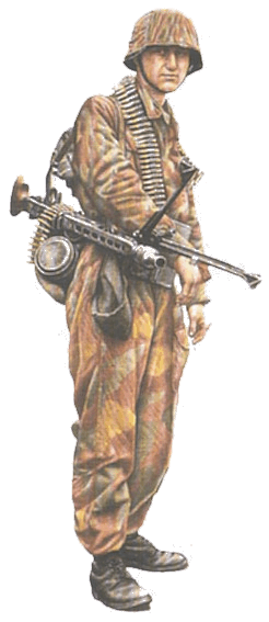 Combatendo em um estreito perímetro defensivo nas cercanias de Caen, o que restava da 12ª SS estava sofrendo, como o resto do Exército alemão, com a escassez de munições, suprimentos e combustíveis. Mesmo com todas as dificuldades os membros desta valorosa unidade continuariam combatendo na região da Normandia até setembro de 1944 perdendo no período cerca de 12.000 homens entre mortos, feridos ou desaparecidos. Após um breve descanso e recompletamento, a Divisão Hitlerjugend ainda combateria o US Army na Batalha do Bulge e enfrentaria o Exército Vemelho nas proximidades de Budapeste, na Hungria. Em 1944 os uniformes camuflados já eram amplamente usados por unidades do Exército alemão, embora a maioria com status de tropas de elite. Este soldado da Hitlerjugend Division está vestindo um jaleco e calças com padrão de camuflagem italiano, com o capacete também coberto com tecido na mesma padronagem. No período final da guerra era comum ver unidades alemães utilizando uniformes fornecidos pelos italianos, uma vez que a sua debilitada capacidade industrial já não conseguia atender a demanda de seu Exército. Ele carrega uma metralhadora MG 42, de 7,92 mm, que ficou famosa por sua confiabilidade, robustez, facilidade de manuseio, mas principalmente por sua capacidade de produzir e manter um impressionante volume de fogo.