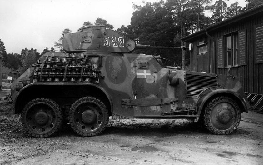 A necessidade de veículos blindados na Suécia era maior do que a oferta. Quando as proibições de exportação de munições foram introduzidas, a oportunidade foi aproveitada e a Suécia "assumiu" cinco veículos blindados L-180 fabricados pela AB Landsverk em nome da Irlanda. Este modelo, juntamente com seu antecessor (modelo L-181), já era um produto de exportação de sucesso antes da guerra e tinha sido vendido para a Dinamarca (2), Estônia (1), Finlândia (1), Holanda (26), Irlanda ( 8)) e Lituânia (6 pcs). Um total de 49 cópias dos carros blindados L-181 e L-180 de Landsverk foram fabricados. Antes que a Suécia apreendesse os carros blindados irlandeses, estes foram oferecidos pela Landsverk à Dinamarca como compensação pelos "Lynx" (carros blindados m / 39) apreendidos, mas os dinamarqueses recusaram. O primeiro pedido do modelo L-181 veio já em 1933 da Lituânia, que foi seguido por um pedido alguns anos depois da Holanda. Depois de uma visita de estudo à Dinamarca quando L-181 foi mostrado, eles voltaram com uma especificação das mudanças; entre outras coisas, o chassis foi alargado e alargado e a inclinação das placas laterais foi ligeiramente alterada para que o veículo se tornasse mais espaçoso. A nova construção passou a ser chamada de L-180 quando o pedido foi feito em maio de 1935. O L-180 de três eixos da Landsverk tinha um design sólido de carro blindado. Um motor de 160 cv de Büssing-Nag deu à tripulação uma velocidade máxima na estrada de 75 km / h. As rodas foram lançadas. A acessibilidade nas laterais da estrada poderia ser aumentada consideravelmente aplicando-se uma chamada "faixa de terreno" sobre as rodas traseiras do boogie (apenas os dois eixos traseiros eram acionados). Para isso, entre outras coisas, foi trazido um macaco de 4 toneladas. Essas faixas de terreno eram fáceis de aplicar e eram usadas em certas ocasiões (por exemplo, quando a defesa contra invasão era para ser praticada em praias arenosas).
